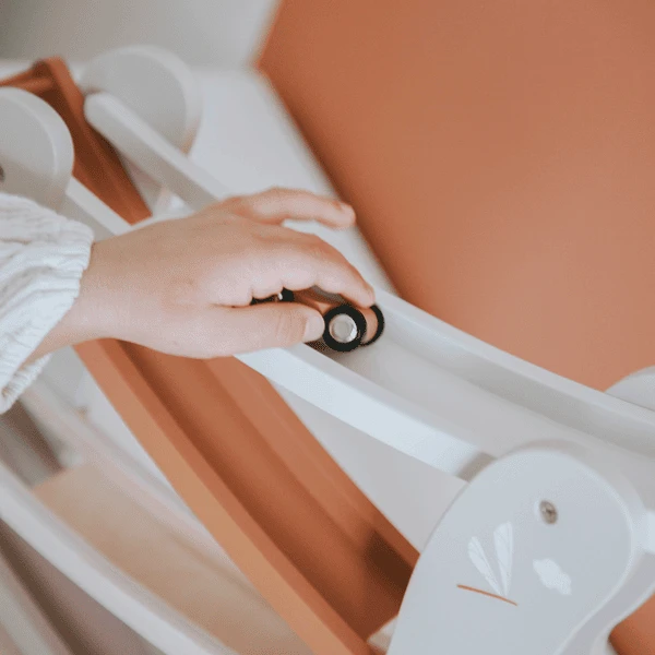 - El empujador de coches Label Label está fabricado en madera de haya de alta calidad con certificado FSC y decorado con pintura al agua apta para niños en suaves tonos verdes, blancos y grises.