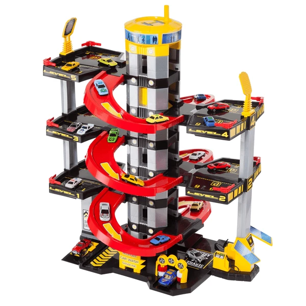 - Mega parking con 6 niveles de juego, incluyendo 5 coches, plataforma elevadora, lavadero de coches y surtidor de gasolina.