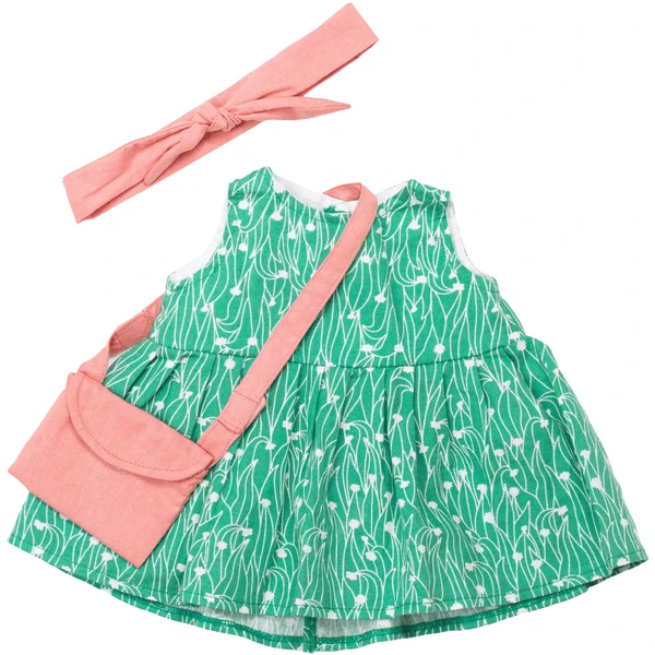 - El conjunto se compone de un vestido verde floreado, una cinta de pelo rosa con cierre de velcro y un bolso rosa.