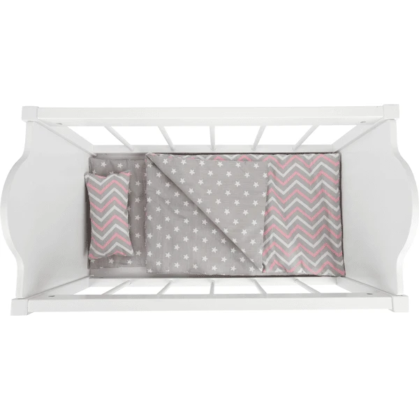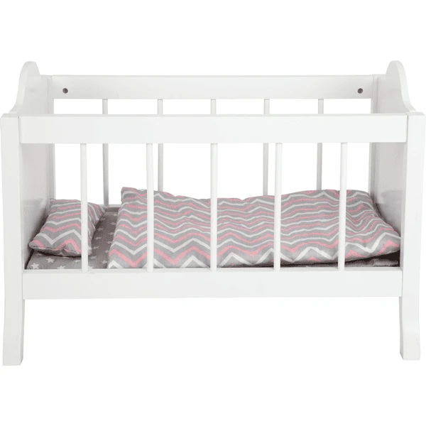 Las muñecas y los peluches duermen particularmente bien en este simple catre porque no pueden caerse. Gracias al barniz blanco, la cama de muñecas de madera resistente se ve muy modern . Un colchón suavemente forrado, así como un edredón y una almohada aseguran el más alto nivel de confort para las muñecas y la ropa de cama reversible con estampado de estrellas redondea perfectamente la Design . Adecuado para muñecas de hasta aprox. 47 cm de largo. Una gran cama para todos los padres de muñecas pequeñas.